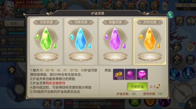 (2)跨服护送灵源,每日16:00-16:30,21:30-22:00双倍护送奖励时间,每日可护送3次,可掠夺5次,掠夺成功才计算次数,单次护送最长时间为10分钟,前5分钟为安全时间无法掠夺。护送成功能获得大奖的铜钱、经验、以及“法身成长丹”。